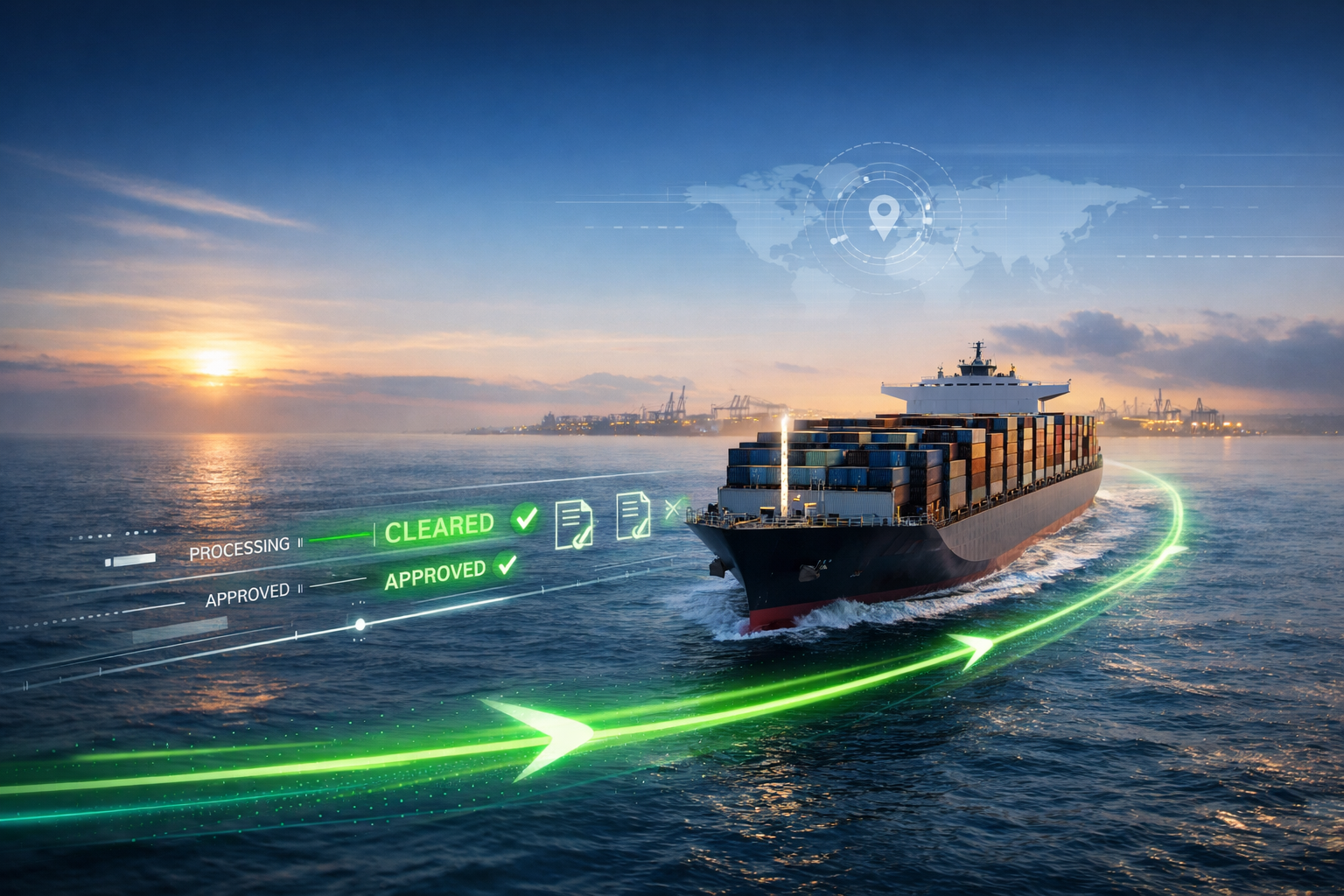 Integração em tempo real entre os atores. Importador, agente de carga, despachante aduaneiro e intervenientes precisam estar alinhados antes da atracação — não depois. A lógica do desembaraço sobre águas exige que decisões e documentos fluam durante o trânsito.